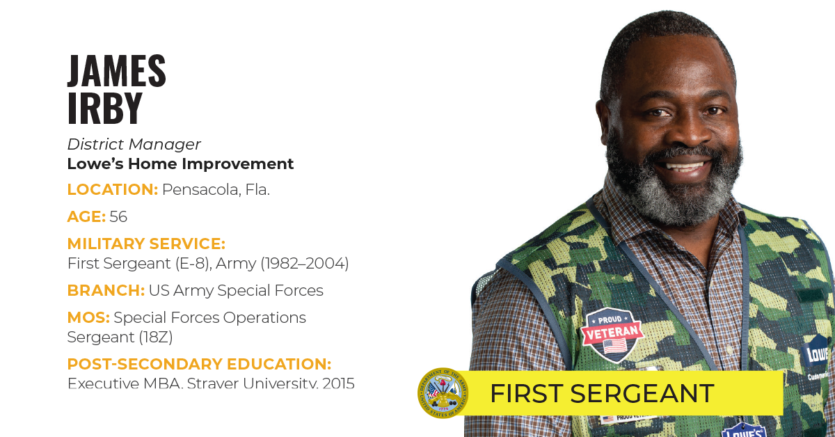 Think a career in retail is just running a cash register? James Irby would tell you otherwise. A career soldier before he hung up his boots for good, Irby took an entry-level job as associate in the appliance department at Lowe’s shortly after retiring from the Army. Today he’s a district manager leading 13 stores and 3,500 employees. Room for advancement in retail?